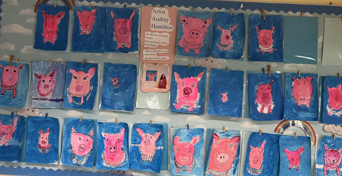 1st & 2nd class had great fun exploring Irish artist Audrey Hamilton’s work. They looked at many of her pieces. They discovered that she uses acrylic paint in her pieces and she loves using bright colours. The children worked hard at recreating one of her pieces. This piece is called Posh Piglet.