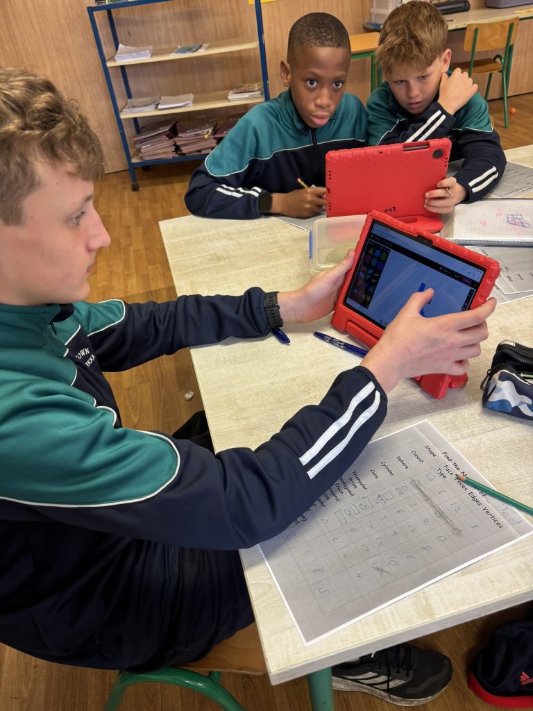 At the Nets Detective Station, pupils explored how 3D shapes can be unfolded into nets. They cut, folded, and assembled paper nets before investigating digital nets using Polypad on the tablets.
