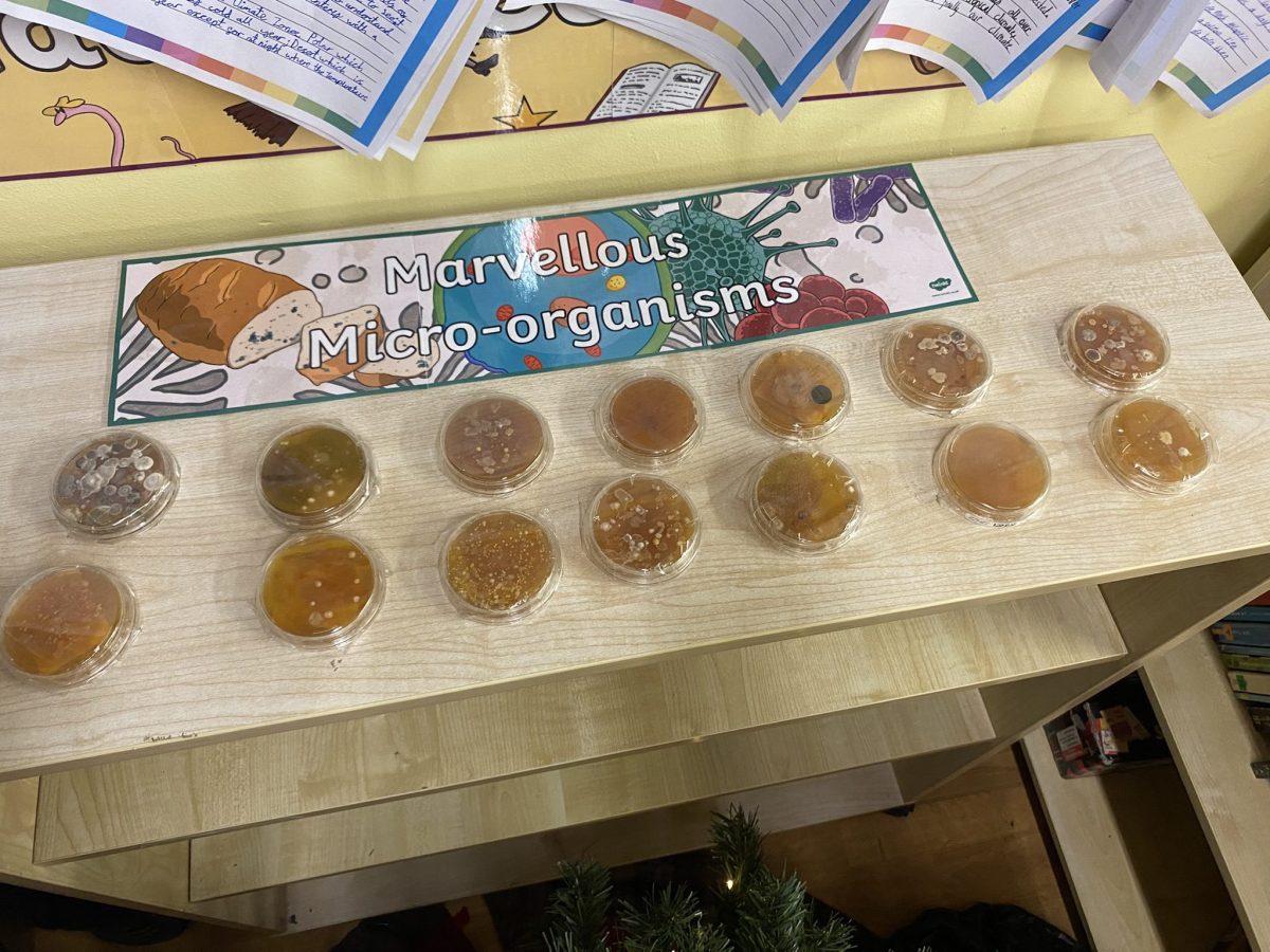 Samples were taken from everyday places such as desks, keyboards, shoes, stair bannisters, the staffroom kettle and even inside our cheeks. Over a two-week period, the children observed and recorded the growth of bacteria on the agar plates. The results sparked great interest — and a fair bit of surprise — as pupils saw first-hand just how many microorganisms can exist on surfaces we use every day.